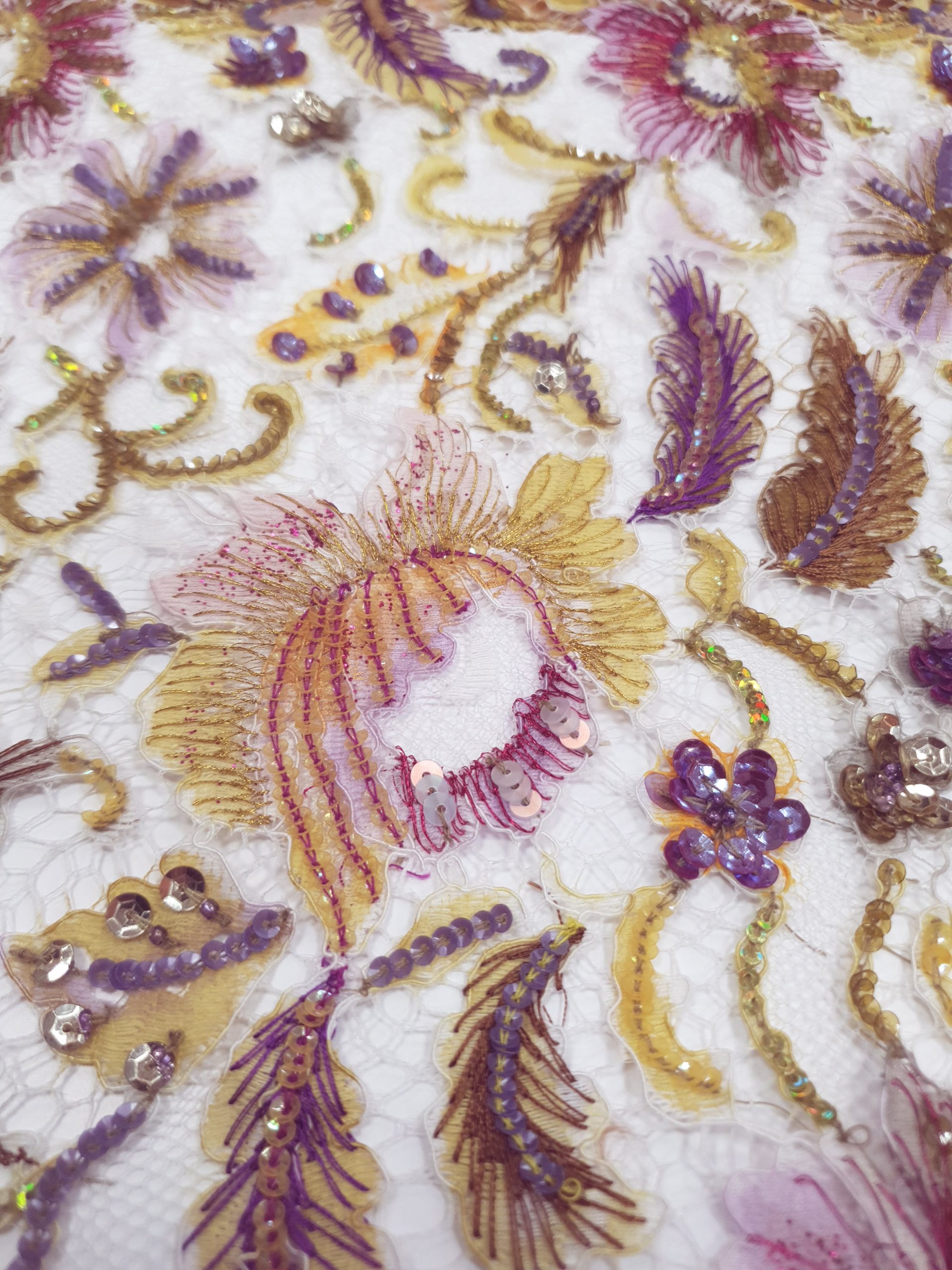 Superbe dentelle de Calais-Caudry multicolore au motif floral dense , produit exceptionnel et unique car entièrement perlé et brodé à l’aiguille, les 2 festons sont identiques.